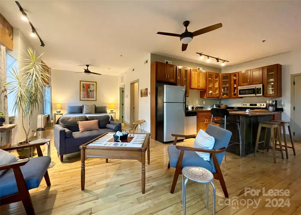Chic urban loft in Downtown Asheville. Absolute central walkable location. One month to one year full service lease. Monthly rent includes all utilities/services and gated surface parking space. Fully furnished including all bed, bath and kitchen essentials. Perfect for executive rental, relocation stay, or extended Blue Ridge Mountain vacation. Pets allowed upon Landlord approval with deposit. Currently in service as short term rental with intermittent occupancy, availability is subject to change, showings by appointment only.